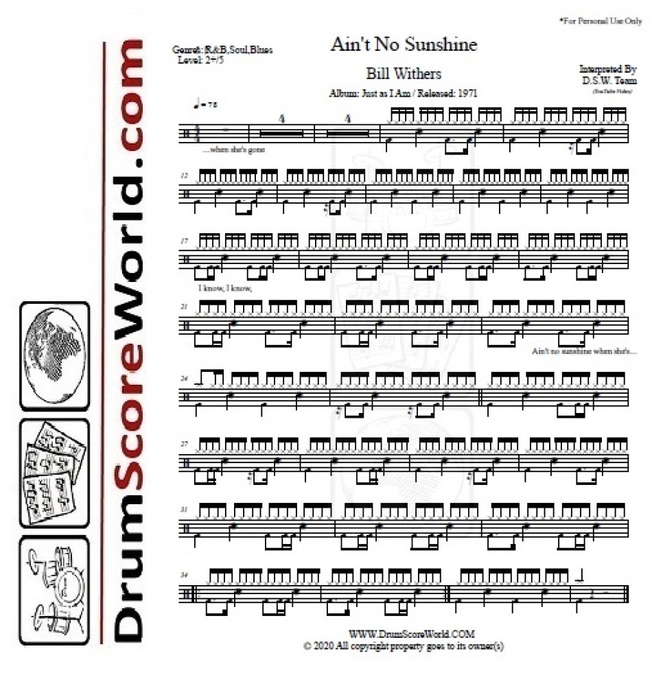 Download the Ain't No Sunshine drum sheet today and groove to this iconic tune!