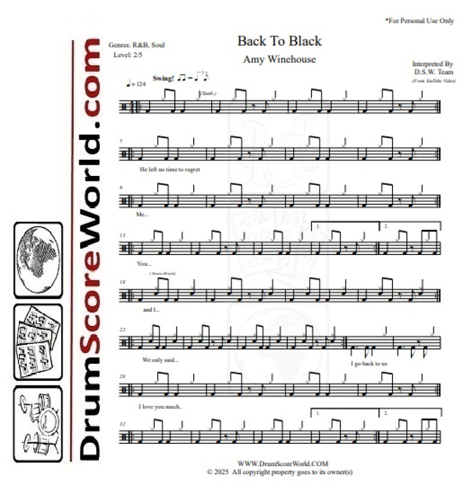 Master the groove, feel, and dynamics of Amy Winehouse – “Back To Black” with this professionally prepared Drum Sheet (PDF) featuring clear lyric-based section cues for precise timing and musical awareness.