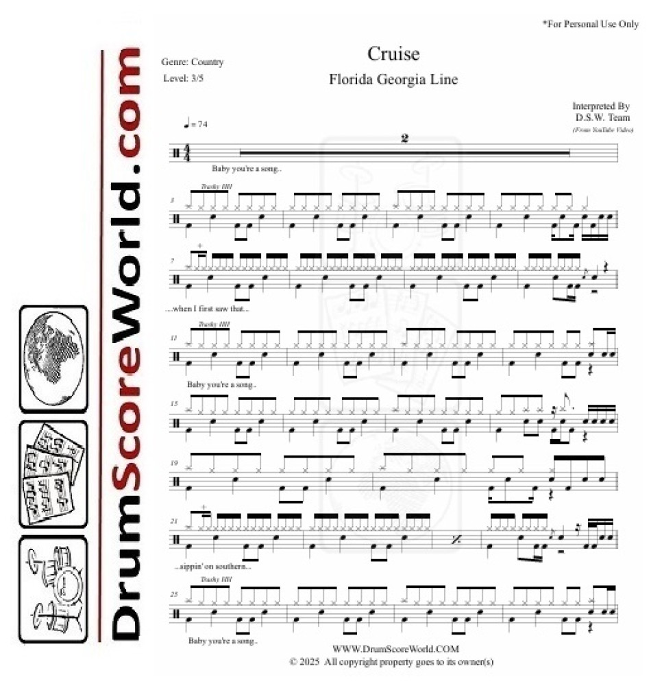 Learn Florida Georgia Line's 'Cruise' perfectly! Our drum sheet music includes the full transcription with lyrics.