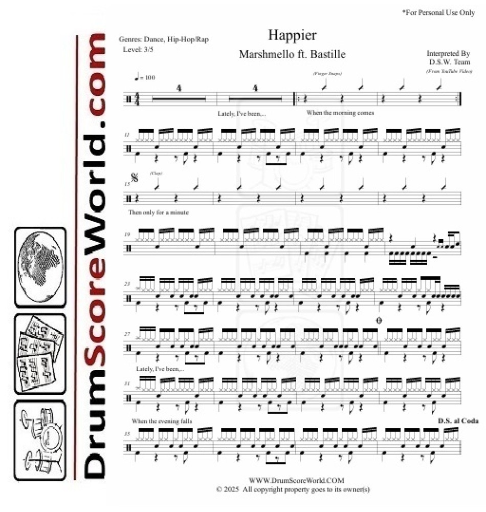 Marshmello & Bastille - Happier - Drum Sheet Music