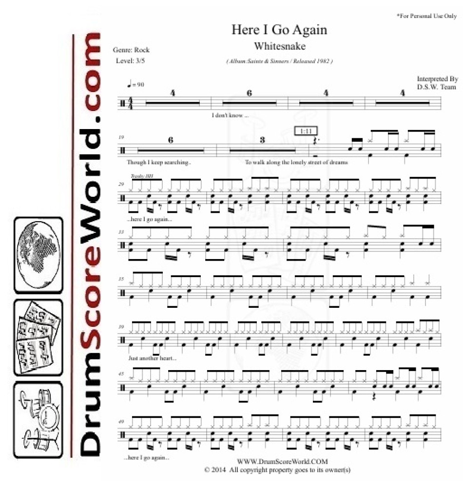 Whitesnake - Here I Go Again Drum Sheet PDF + Professional Play-Along Backing Track