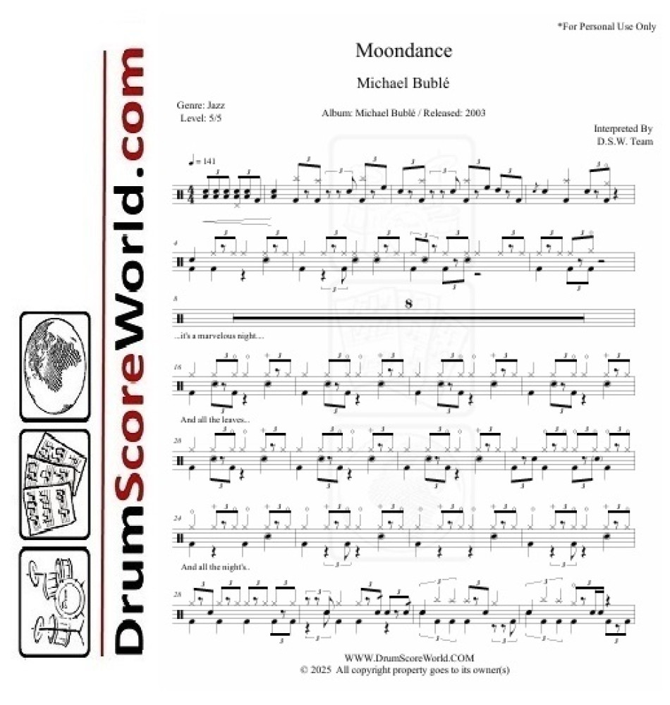 Unlock the smooth, jazzy feel of Michael Bublé's classic hit, "Moondance." on Drums | PDF Download