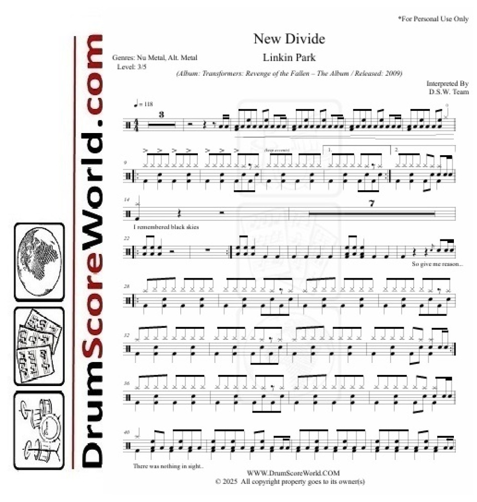 Calling all drummers! This professionally transcribed drum sheet music for "New Divide" by Linkin Park (featuring Rob Bourdon’s powerful grooves) comes with a high-quality play-along track, making it perfect for practice, live performance, or drum covers.