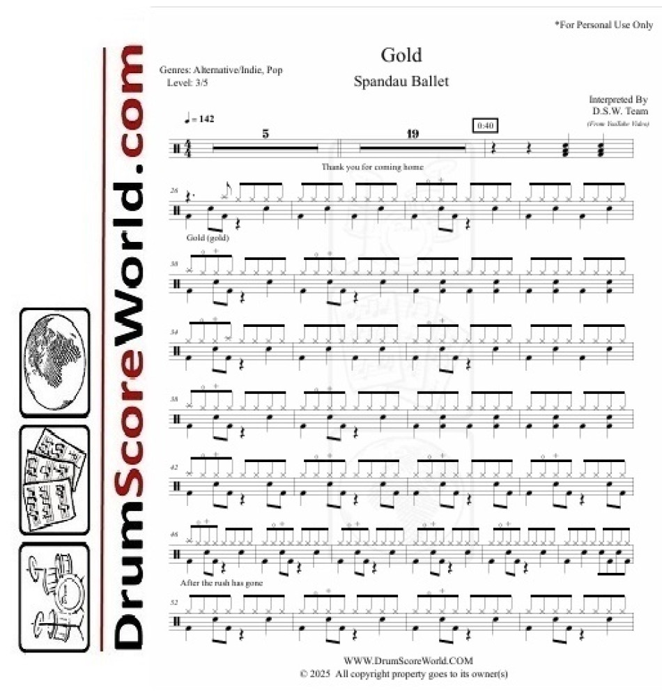 Welcome to the Drum Sheet & Lyrics Cue page for “Gold” by Spandau Ballet — a classic 80s hit reimagined for drummers! Whether you’re learning the iconic groove or preparing for a cover performance, this chart includes: