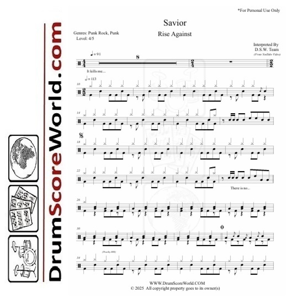 Rise Against - Savior - Drum Sheet + Play-Along Track
